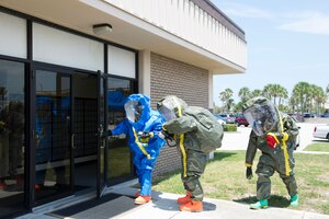 Col. Steven Lang, 45th Launch Group commander, presents Lt. Col. Waylon Mitchell, 5th Space Launch Squadron commander, with a guidon during a change of command ceremony July 7, 2016, at Cape Canaveral Air Force Station, Fla. Changes of command are a military tradition representing the transfer of