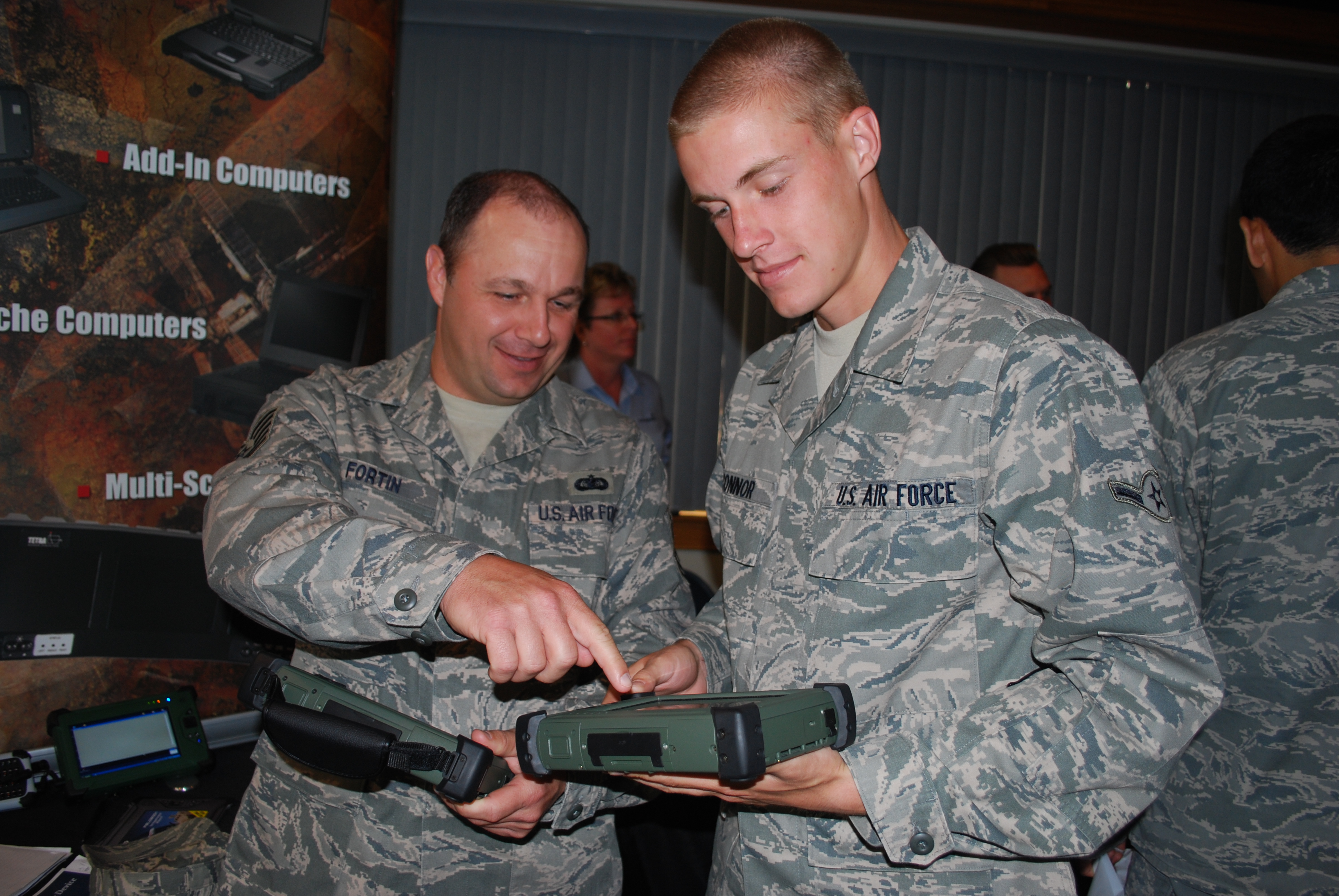 Tech. Sgt. Tod Fortin and Airman Michael O'Connor of the Air Force Technical Applications Center compare field computers at the Patrick Air Force Base Technology Expo April 21 at The Tides. Organized by the Cape Canaveral Chapter of the Armed Forces Communications and Electronics Association, approximately 25 vendors turned out to showcase their wares. (U.S. Air Force photo/Senior Airman David Dobrydney)